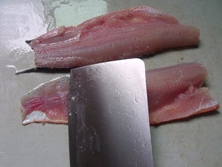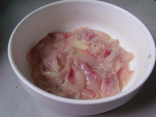3、魚肉塊洗干凈血污,下面放一塊廚房巾,刀斜40度,從尾部開始片魚,方向是刀刃朝向尾部。片成魚片!片好的魚片,用一湯匙鹽搓洗一遍后沖水反復(fù)淘洗成晶瑩透明的魚片。一定要洗成透明的魚片,魚肉比較有口感,而且清爽。魚片用鹽一茶匙 白胡椒一茶匙 蛋清半個(gè) 干淀粉三茶匙腌漬,用手仔細(xì)反復(fù)抓拌均勻。靜置20分鐘!