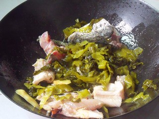 4、酸菜切絲焯水備用。辣椒切圈和花椒一起。魚頭骨魚皮準(zhǔn)備好,姜切片。鍋里放油炒香蔥姜蒜,下入魚頭魚尾魚骨頭魚皮等炒一分鐘。放入酸菜繼續(xù)炒一分鐘。兌足量開水。