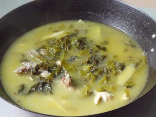 大火燒開,中火煮20分鐘到魚湯白。調(diào)入鹽。把湯中料都撈出來鋪在碗底。(各家吃鹽大小不一樣,一定要調(diào)自己的口味)