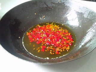7、鍋里放油,涼油的時(shí)候就放入花椒和辣椒圈,小火燒,注意看辣椒,變得紅中微黃且油亮干酥。注意觀察別熬過火了。