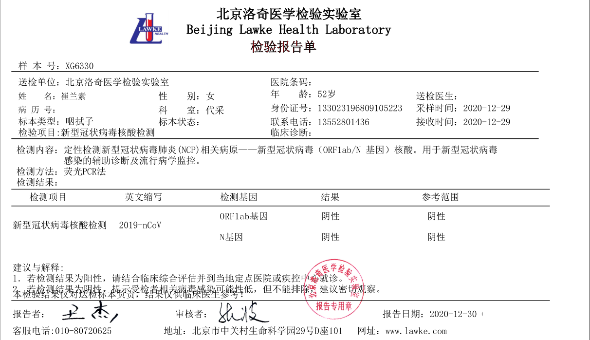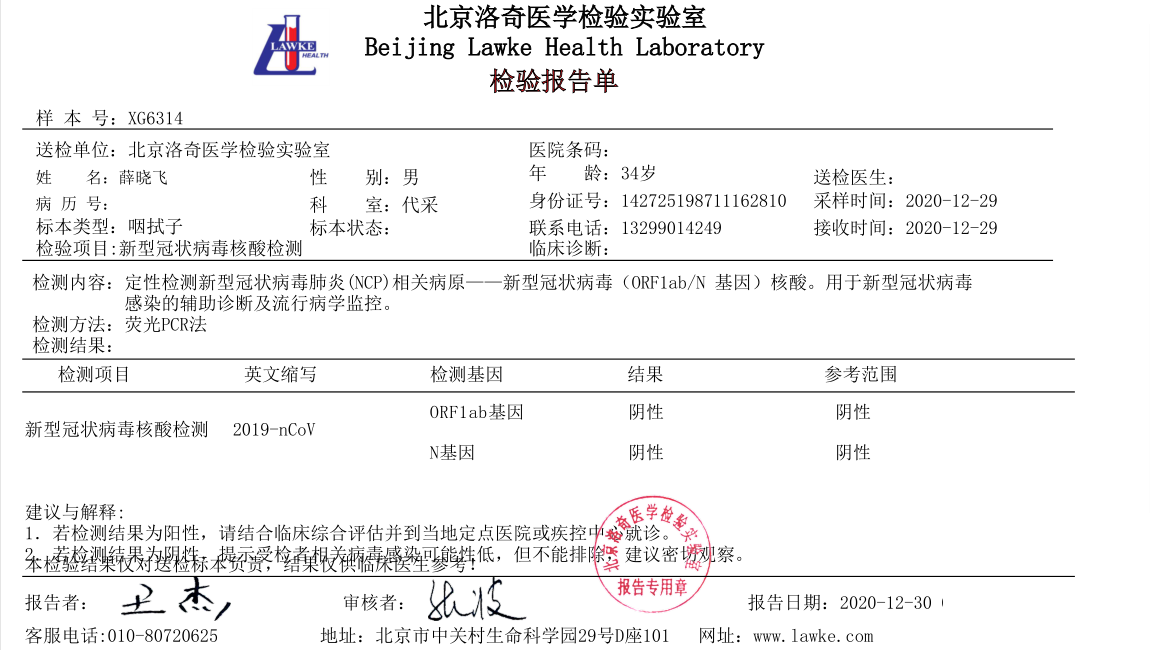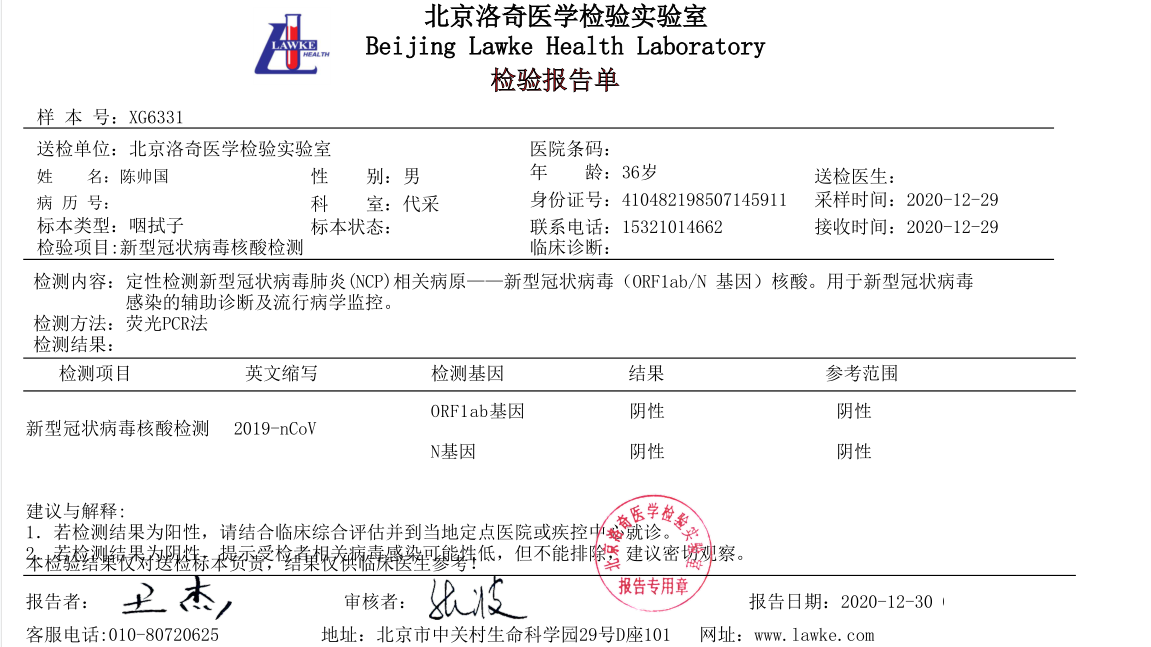 ? ? ? ?目前隨著國內(nèi)部分地區(qū)新型冠狀病毒的零星出現(xiàn),對人們心理上增加了許多恐慌,京朝軒餐飲為了安全起見,對食堂在職員工集體統(tǒng)一做了核酸檢測,下面是部分人員核酸檢測報告證明: