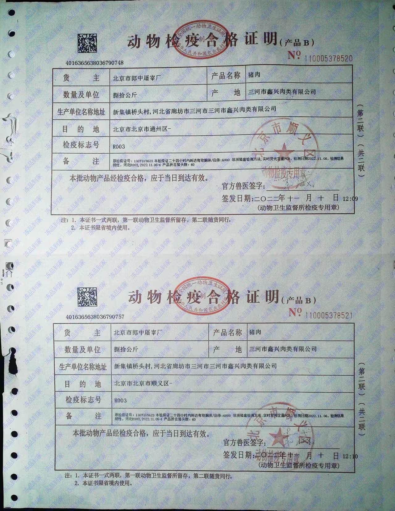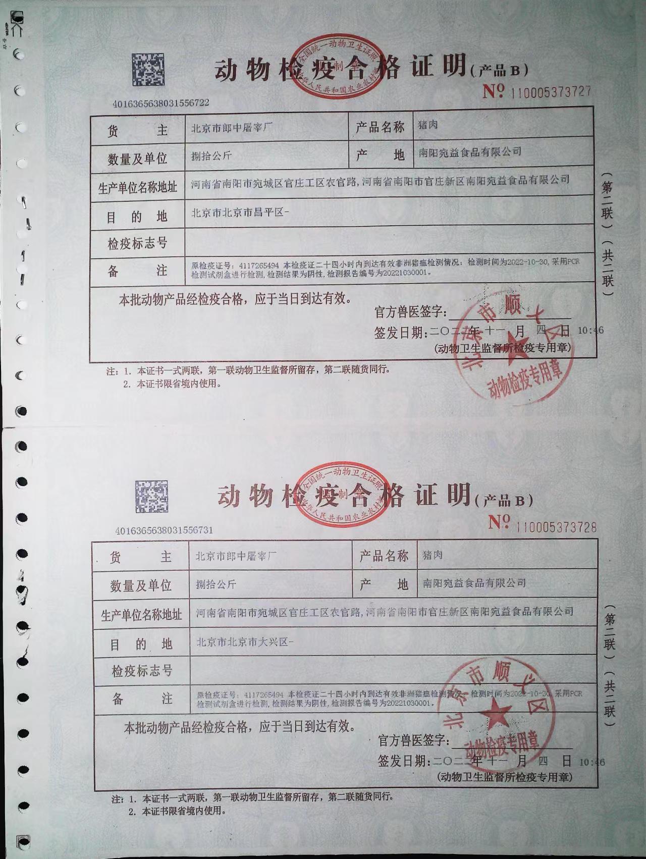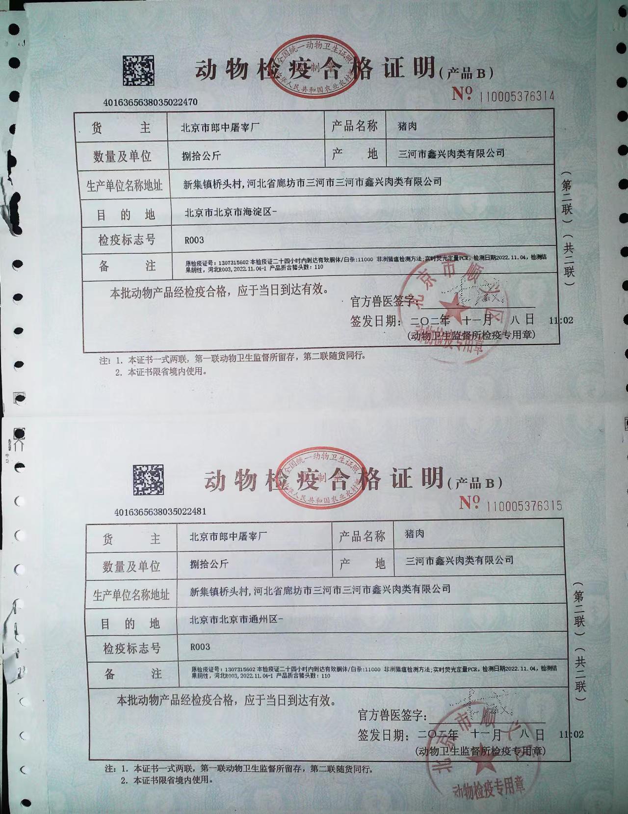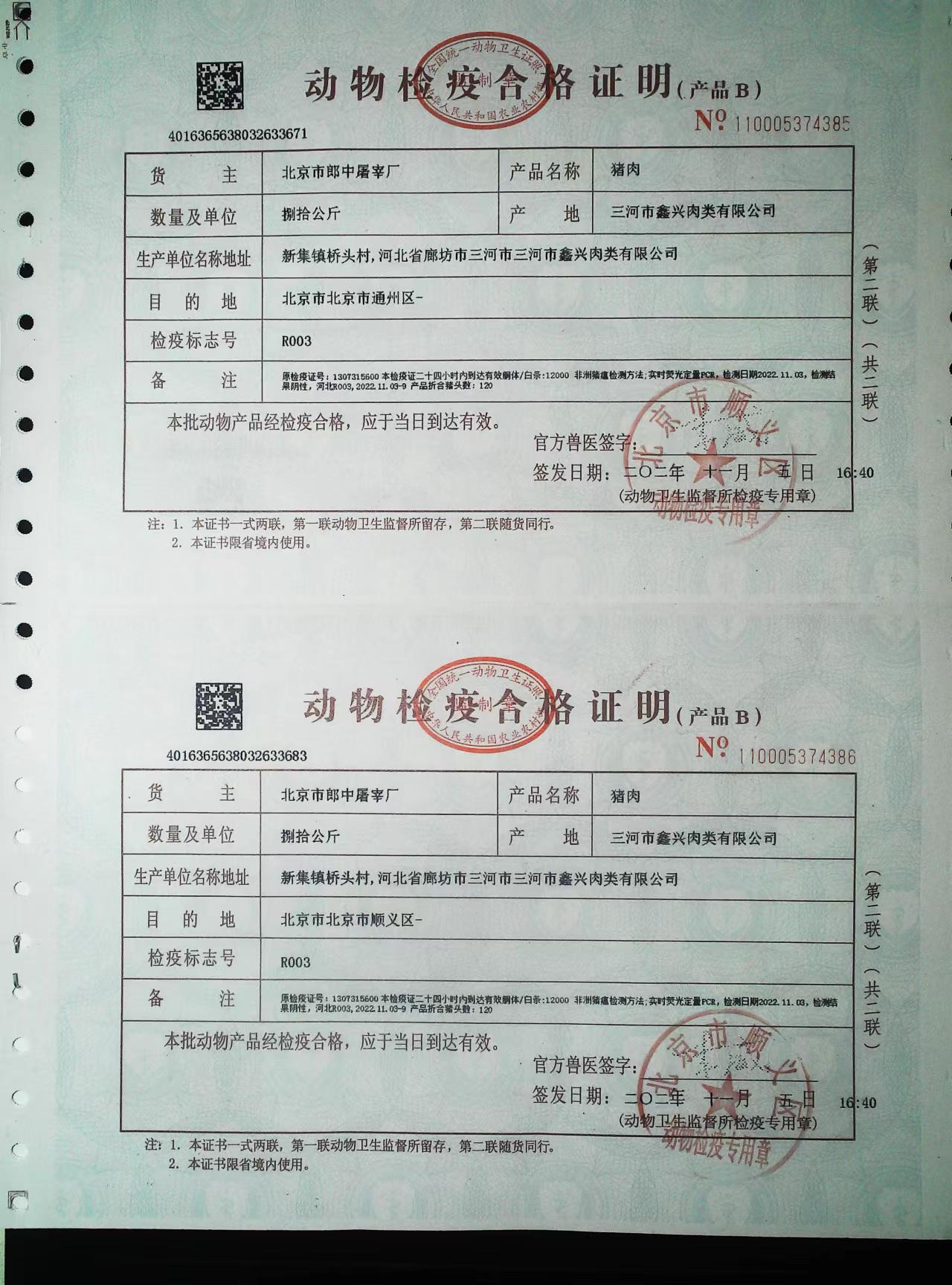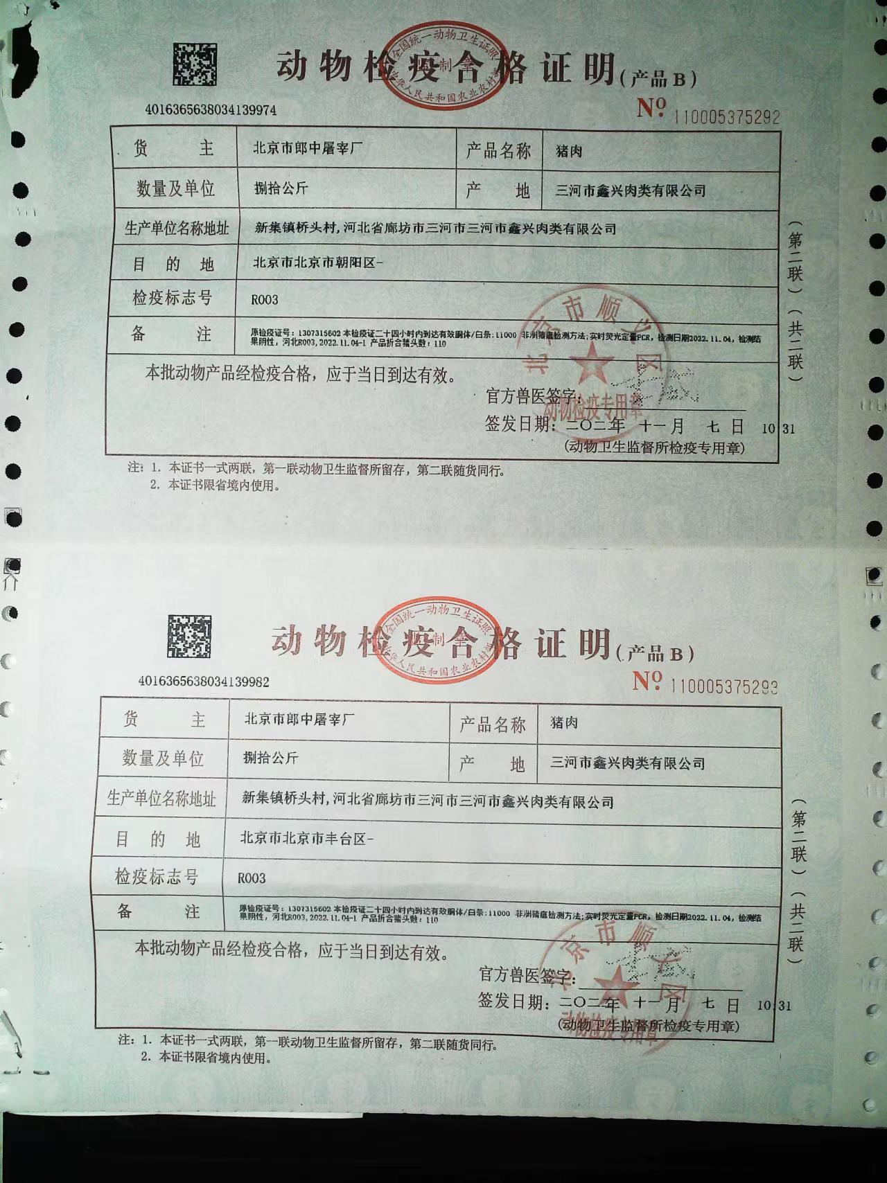 京朝軒食堂承包豬肉類采購動物檢疫合格證明